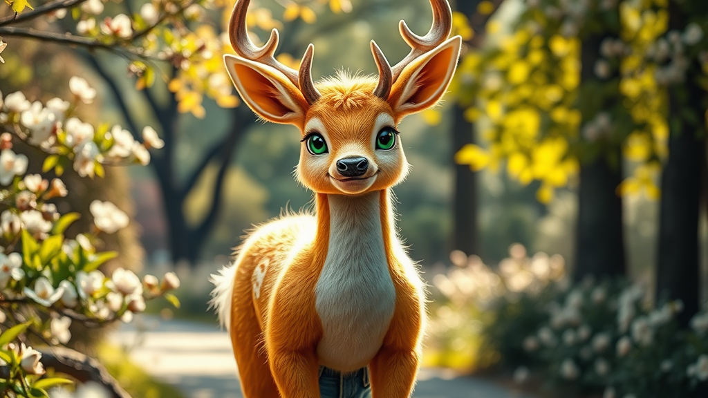 Anthro furry deer with yellow fur and skin, standing in a park setting. The character, a muscular figure with a charming smile, has soft, fluffy features and is dressed in jeans. He has striking green eyes that reflect the ambient light, while shadows and illumination highlight his form. With an ultra-realistic and ultra-detailed appearance, the scene captures a sense of tranquil nature through blooming flora surrounding him. Despite the vibrant detail, there are subtle hints of imperfections, creating a dynamic contrast that enhances the overall quality. The art showcases a blend of realism and fantasy, encapsulating the essence of anthropomorphic artistry.