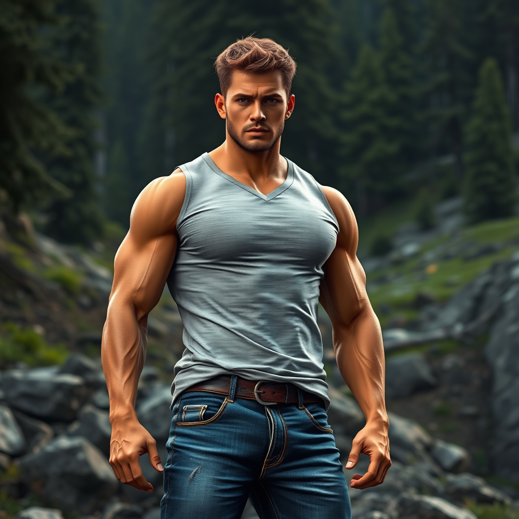Anthro male adult with a muscular build wearing jeans and a fitted t-shirt, set against a highly detailed and realistic wilderness background featuring dense forest and rugged terrain. The scene captures a photorealistic and ultra-detailed quality, emphasizing natural beauty and the character's strong presence in this serene yet challenging environment.