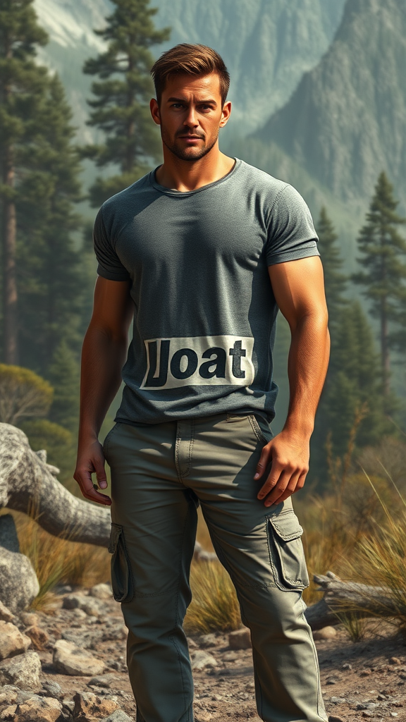 Anthro male, adult, with a muscular build wearing pants and a t-shirt, set against a detailed wilderness background, photorealistic style with ultra-detailed features, realistic proportions and natural pose.