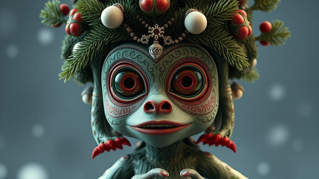 Anthropomorphic charming Christmas tree creature with oversized eyes and an expressive face, featuring detailed and intricate patterns, showcased in a close-up. The design embodies elegance and features elaborate details reminiscent of digital paintings found on ArtStation, inspired by the styles of Krenz Cushart, Artem Demura, and Alphonse Mucha. Rendered with octane for a high-definition, polished look, this concept art boasts 4K resolution and highlights a composition of stacked torsos resembling a totem pole. The piece intriguingly includes elements of poor anatomy, extra or missing limbs, and a sense of mutation, resulting in an unsettling yet fascinating character with distorted and blurry features and the presence of text.