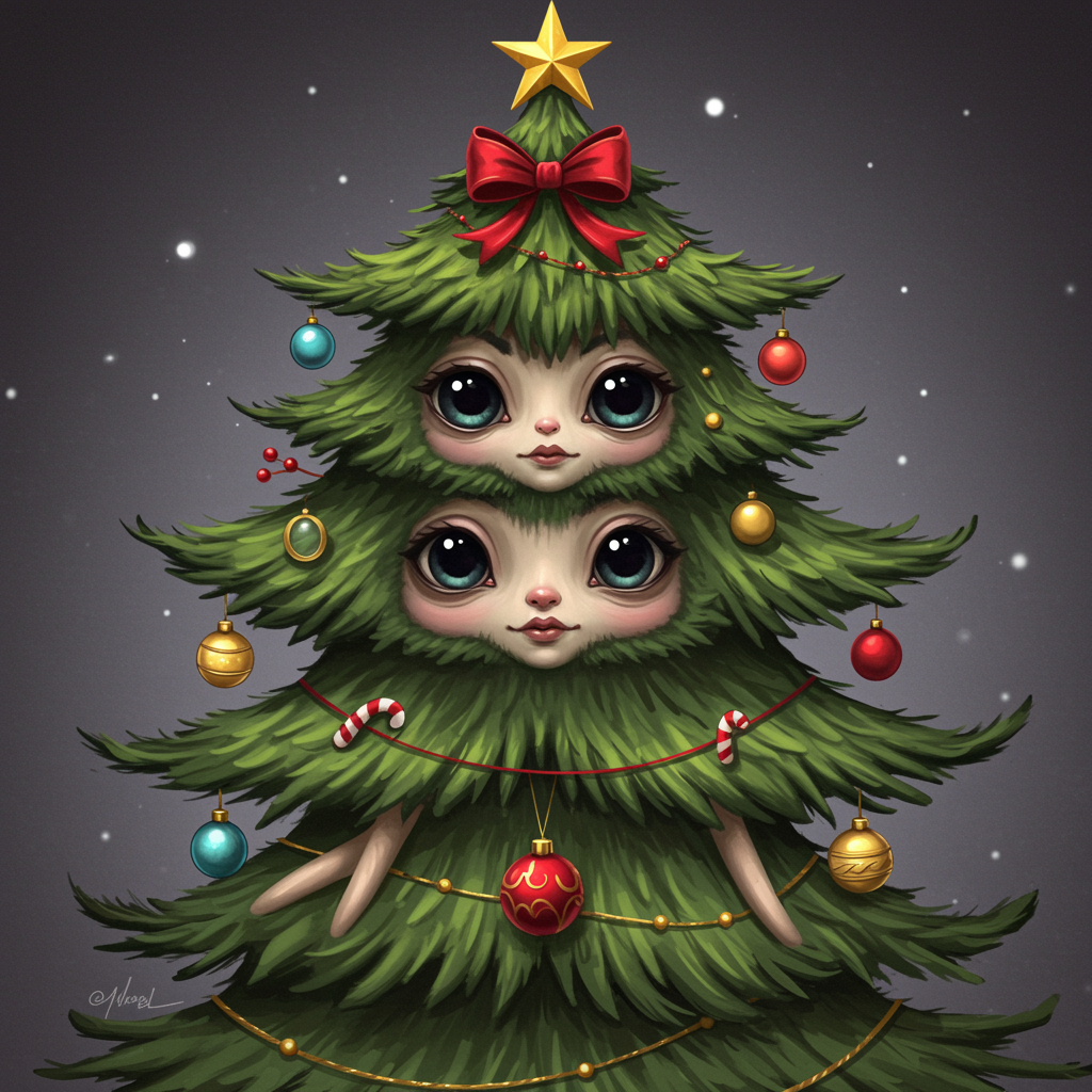 Anthropomorphic Christmas tree creature with a cute yet monstrous appearance, adorned with large expressive eyes and a whimsical face. This elegant and intricate digital painting features a close-up of the creature, showcasing its highly detailed and smooth textures. Inspired by the art styles of Krenz Cushart, Artem Demura, and Alphonse Mucha, the artwork captures a mystical charm. The creature seems to have stacked torsos akin to a totem pole, and features poorly drawn anatomy with amusing distortions such as extra, missing, and floating limbs, only to create a sense of whimsical mutation. These imperfections contribute to its quirky and oddly enchanting presence, reminiscent of an artstation concept art, rendered in 4K resolution with octane precision, highlighting its strange elegance amidst intricate details. The result is an intriguing blend of beauty and subtle grotesqueness in a festive yet mysterious Christmas tree form.