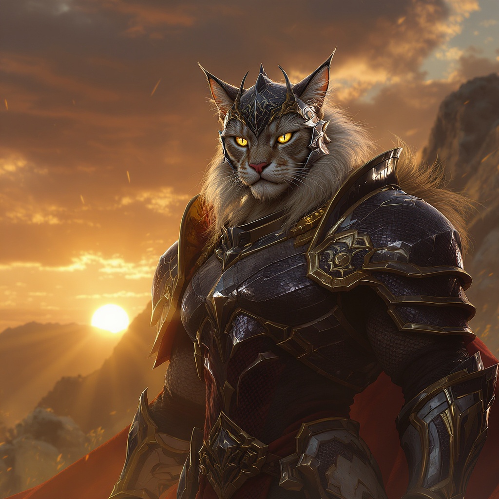 View this AI-generated image featuring a majestic anthropomorphic feline warrior adorned in intricately designed armor with a distinctive helmet featuring subtle feline motifs standing proudly in a heroic pose the scene is backlit by the warm glow of a setting sun sending cascading light rays throug