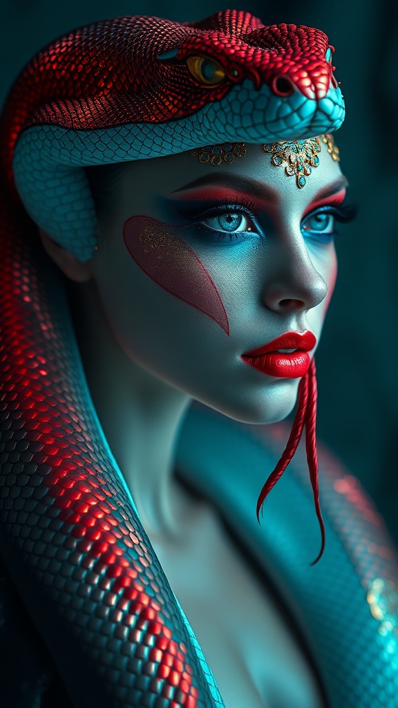 An enchanting anthropomorphic female snake adorned with mesmerizing red, blue, and gold makeup that accentuates her striking features. Set against a captivating backdrop of dark teal and white, the scene evokes an aurorapunk aesthetic. This stunning portrait captures the realism and vividness of her form, with scales glistening like jewels. Her graceful presence emanates an aura of mystique and allure, drawing the viewer into a world where fantasy meets reality. The image pulsates with an artistic energy, offering an enchanting visual experience that leaves a lasting impression.