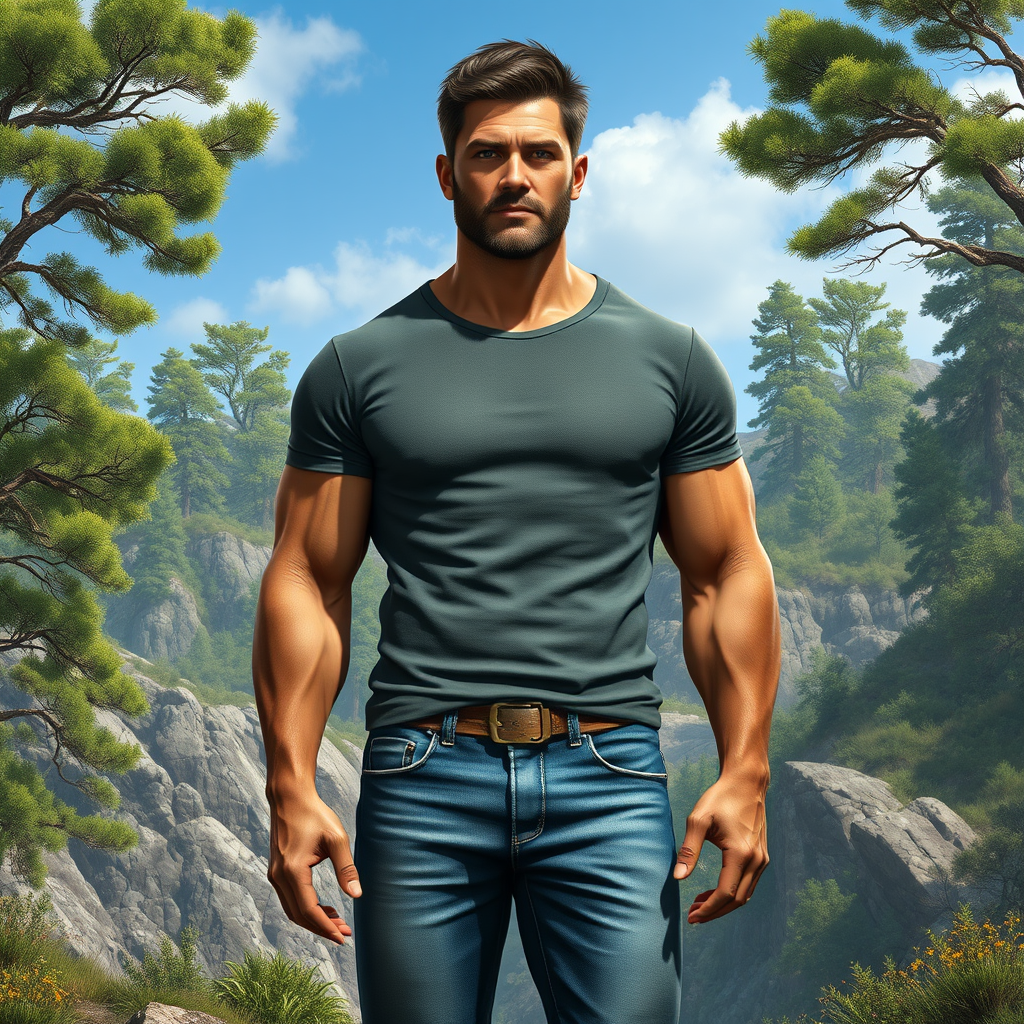 Anthropomorphic male character, adult and muscular, wearing a pair of jeans and a fitted t-shirt, set against a detailed wilderness background featuring lush trees, rocky terrain, and a clear blue sky, rendered in photorealistic, hyper-realistic detail with an emphasis on natural textures and vivid colors.