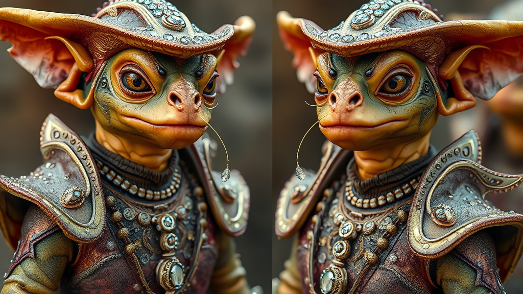 Anthropomorphic Targarian dressed in shimmering attire, captured in professional macro photography with four detailed, extreme close-up shots. Each image exhibits sharp focus through natural light, taken with a Canon EOS 5D Mark IV DSLR, using an f/8 aperture, 1/250 second shutter speed, and ISO 100. High-quality and award-winning, the photography showcases a glibatree style emphasizing meticulous attention to detail. Images are neither blurry nor dim, avoiding the generic and plain, while ensuring they are vibrant and clear.