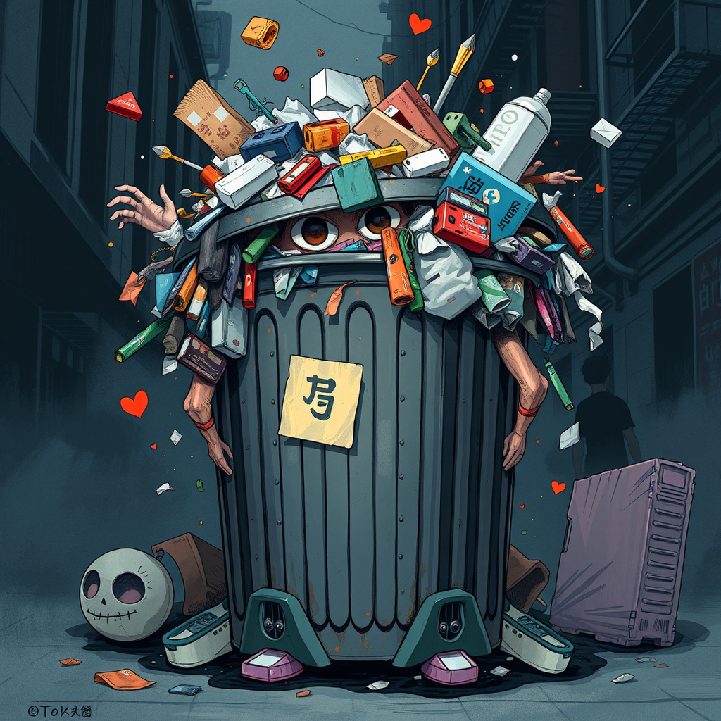 Anthropomorphic trashcan from Tokyo brimming with colorful refuse, viewed from afar, exhibiting mixed elements of whimsy and melancholy. Crafted in a style reminiscent of Yoshii Chie's playful characters, Hikari Shimoda's ethereal visions, and Martine Johanna's vibrant compositions, the trashcan exudes a surreal presence. Rendered in finely detailed concept art with intricate inkwork, the scene unfolds in a dark fantasy setting where the mundane meets the fantastical. The trashcan's features hint at a mysterious backstory, with eyes peeking through overflowing garbage and limbs subtly integrated into its cylindrical form. The color palette is both vivid and shadowy, highlighting a striking contrast between light and dark elements in a digital 2D landscape.