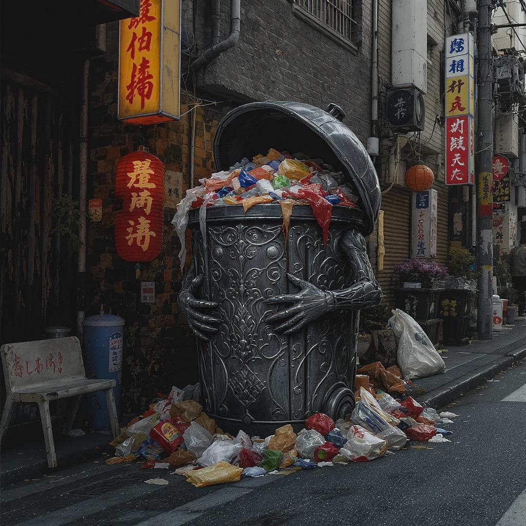 Anthropomorphic trashcan in a Tokyo alley, overflowing with vibrant garbage, blending dark fantasy and whimsical elements, crafted in the style of Yoshii Chie, Hikari Shimoda, and Martine Johanna, highly detailed, concept art, ink sketch, digital 2D, intricate designs enveloping the metallic surface, subtle hints of urban decay merging with surreal touches, distant view capturing its enigmatic presence in a bustling cityscape.