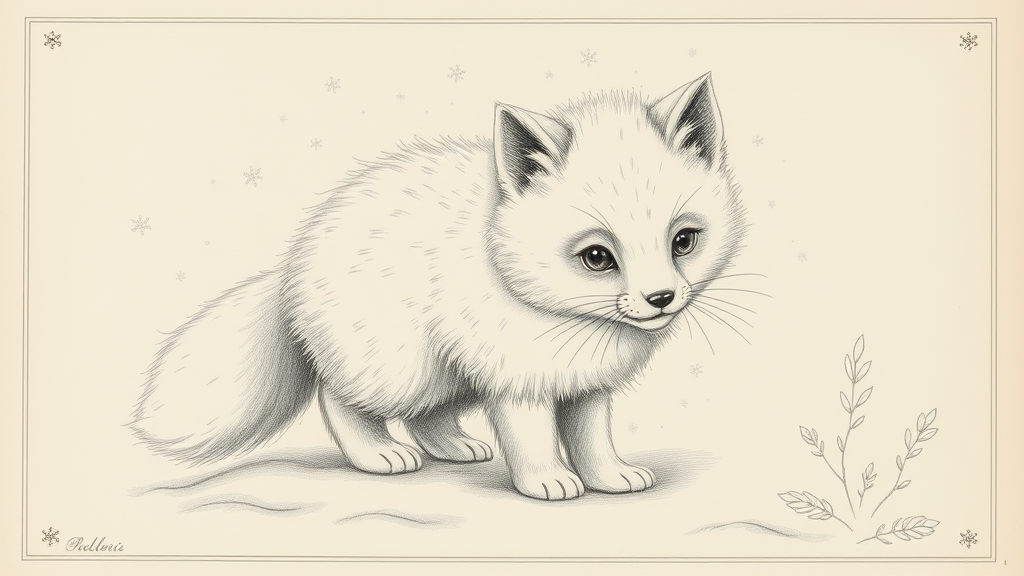 Antique lithograph depicting a full-page sketch of an adorable white, fluffy hybrid creature, blending features of a wild snow fox and a cat. The baby animal's round, curious eyes and delicate paws are carefully detailed, with a whimsical tail combining fox-like bushiness and feline grace. The illustration captures a playful, innocent expression, set against a backdrop of softly textured snowflakes. Additional creative touches include subtle hints of natural habitat elements like small winter plants and gentle rolling snowdrifts, all encompassed within an elegant, vintage-style border for a timeless aesthetic.