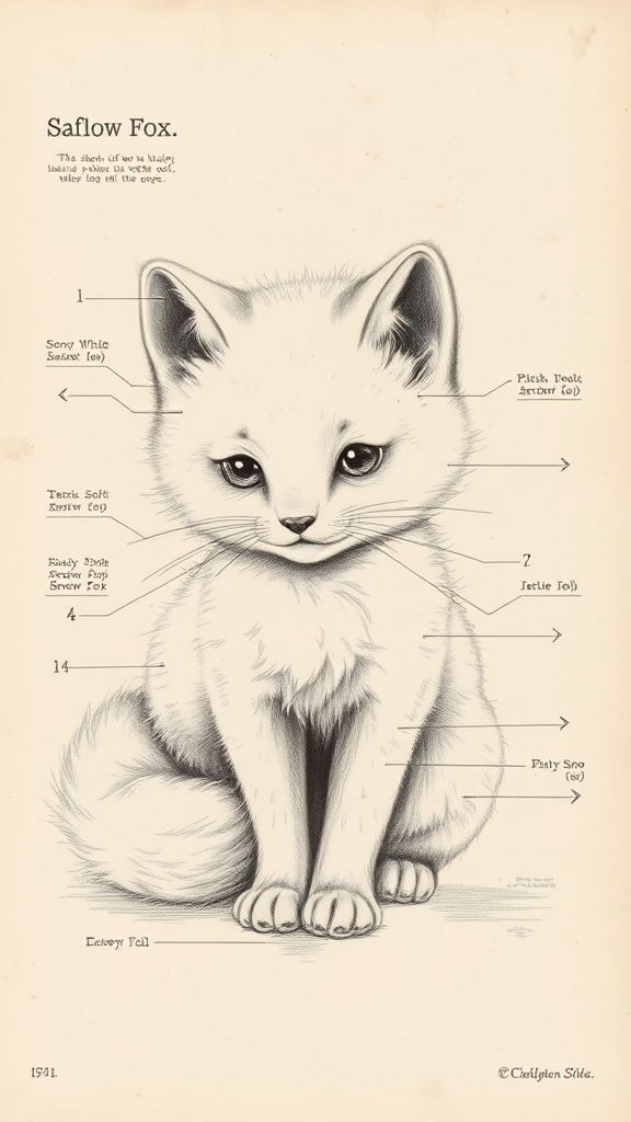 Antique lithograph illustration depicting an intricately detailed schematic of an adorable, soft white snow fox and cat hybrid. The baby creature features the fluffy fur and bushy tail of a snow fox, combined with the playful whiskers and curious eyes of a kitten. Enhanced with artistic embellishments, this sketch captures the essence of the enchanting creature with delicate strokes and subtle shading to emphasize its whimsical nature and the imaginative fusion of its animal features.
