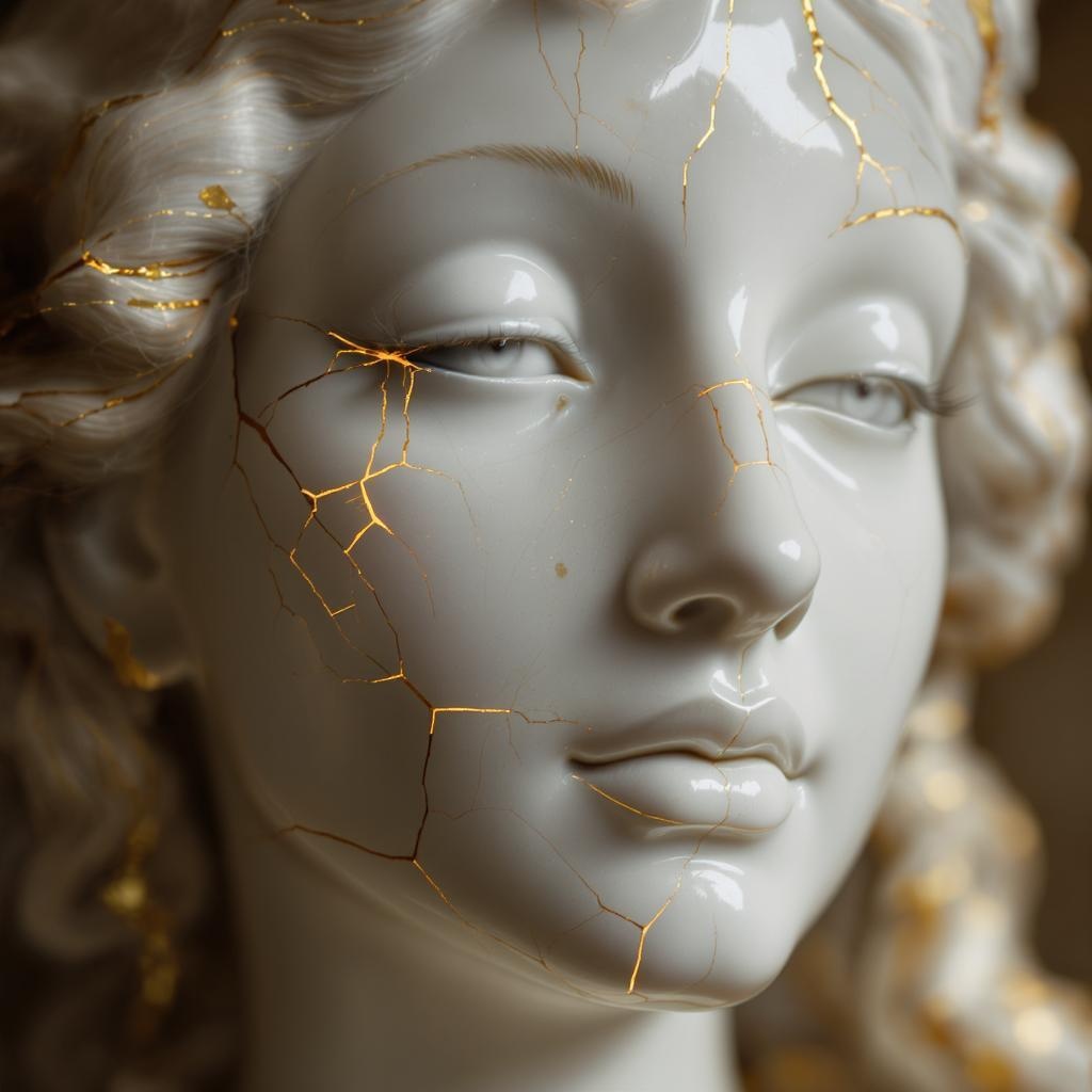 Antique porcelain face, adorned with golden veins of Kintsugi, the delicate fractures transformed into a tapestry of luminous scars, whispering stories of resilience and rebirth.