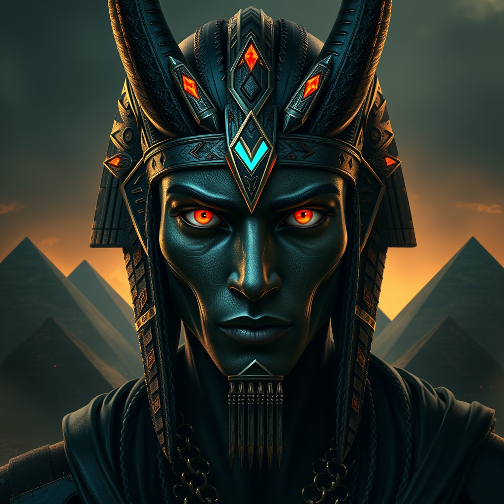 Anubis portrait as a cyberpunk Egyptian male, set against a backdrop of black pyramids. The art captures his hyperdetailed eyes in an epic masterwork style, blending hyperrealism with dark fantasy. Inspired by Greg Rutkowski, the piece is an intricately detailed matte painting for concept art. With dynamic Eldritch lighting and an emphasis on hyperdetail, the composition is in 8k resolution, reminiscent of trending Artstation splash art. The atmosphere is intentionally distorted with elements like blurred and grainy textures, draft-like features, and a focus on unique body forms. The presentation explores themes of disfigurement and deformation but maintains a captivating aesthetic with a mysterious allure. The scene avoids perfect symmetry and conventional beauty, showcasing creative chaos in a visionary manner.