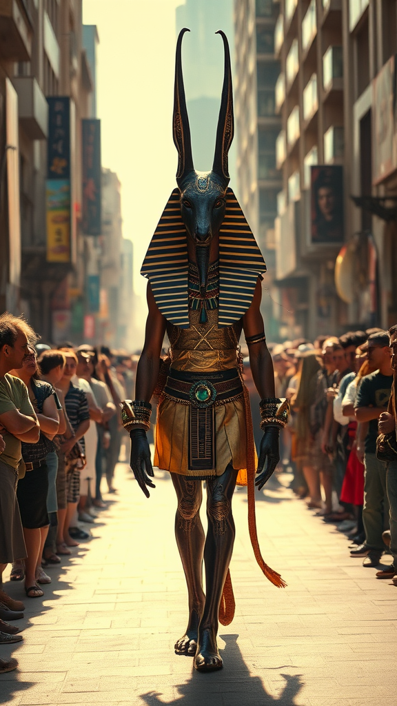 Anubis, the ancient Egyptian god with a jackal's head, walks gracefully through the bustling streets of modern Cairo, surrounded by a sea of amazed onlookers, each frozen in a moment of disbelief and awe under the bright midday sun. His ethereal presence casts an enigmatic aura, blending past and present in a seamless cinematic vision. His eyes, like glistening orbs of polished obsidian, scan the lively environment filled with vibrant colors and sounds, capturing the contrast of tradition and modernity. The air is crisp, heightened in HDR clarity, revealing every detail from his ornate ancient garb to the shimmering heatwaves rising from the pavement. The scene is depicted in stunning ultraphotorealistic 8k detail, displaying the delicate interplay of light and shadow, where each figure in the crowd reflects the varying human emotions of wonder, fear, and respect in a vertical 9:16 aspect ratio.