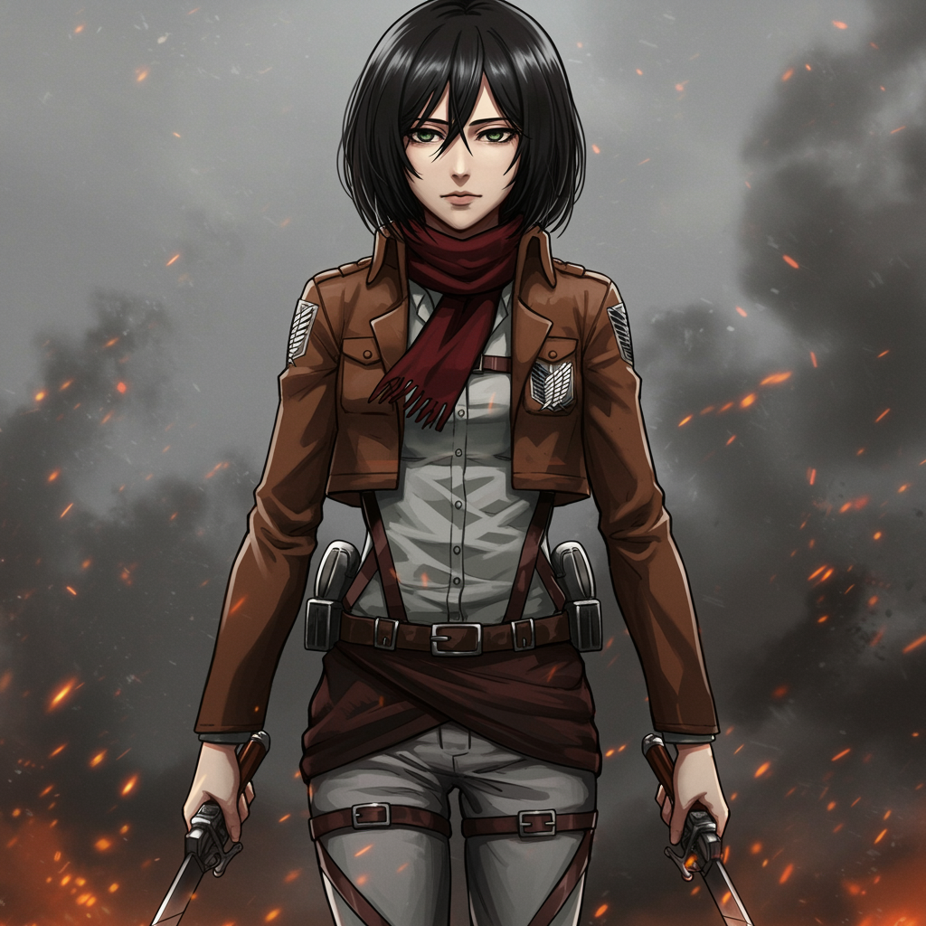 AOT style, inspired by Shingeki no Kyojin, featuring Mikasa Ackerman, a lone girl with arm straps, bangs framing her face with short black hair, dressed in black pants and a brown jacket. She has green eyes and a red scarf, wearing a harness over her white shirt with long sleeves. The scene captures a cowboy shot, set against a grey background with drifting smoke and glowing embers. Her gaze is direct, exuding strength. The attire prominently displays the Survey Corps insignia. The artwork is in high quality, blending 3D elements with a cartoon and anime style. The character is depicted with natural skin texture, maintaining a realistic portrayal, avoiding exaggerated features.