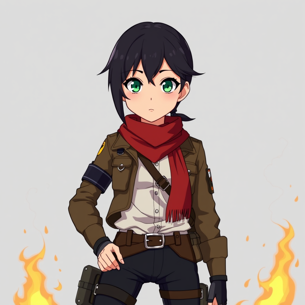 AOT style inspiration, featuring Mikasa Ackerman, depicted as a strong, solo character. She has black hair styled with bangs and hair between her eyes, complimented by striking green eyes. She's wearing an arm strap and harness over a white shirt and brown jacket, characteristic of the Survey Corps. Her outfit includes black pants with a thigh strap, and she's wearing a signature red scarf around her neck. This scene captures her in a cowboy shot, surrounded by embers and smoke, against a grey background. Her medium build and focused expression face the viewer, adding depth to her character. The setting is animated with high-quality 3D cartoon sketches, enhancing the anime style.