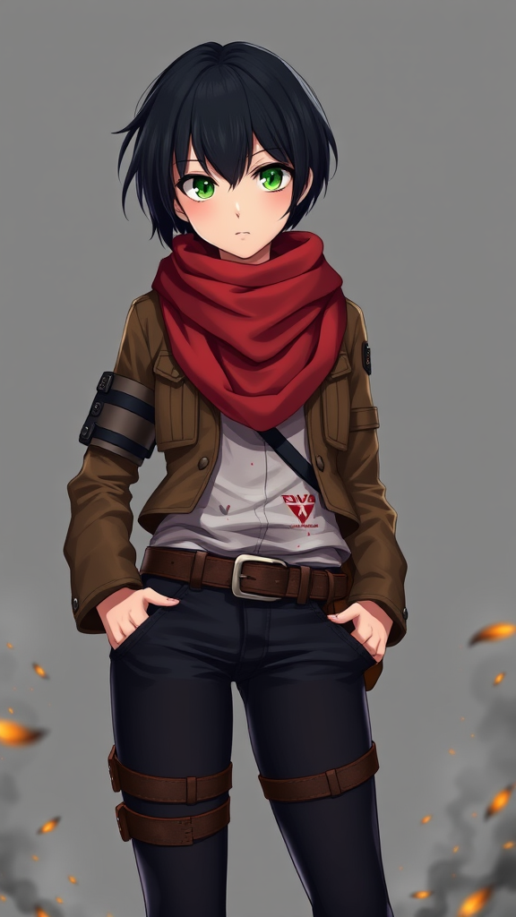 AOT style, inspired by Shingeki no Kyojin, featuring a character resembling Mikasa Ackerman. A 1girl with arm strap, bangs, and black short hair with strands falling between her green eyes. Dressed in a brown Survey Corps jacket, black pants with thigh straps, and a form-fitting white shirt underneath spotted with embers and smoke. She has a red scarf wrapped around her neck, symbolizing warmth amidst turmoil. The character is depicted in a cowboy shot against a grey backdrop, capturing her medium build and defined features. Her harnessed gear reflects readiness for battle, and her intense gaze locks onto the viewer, telling untold stories of strength and resilience. The environment has a touch of the surreal with gentle embers floating, adding a dynamic depth to the scene. The character's athletic form is highlighted, blending anime aesthetics with a slightly stylized, cartoonish 3D element, ensuring the essence of the AOT world remains vivid.