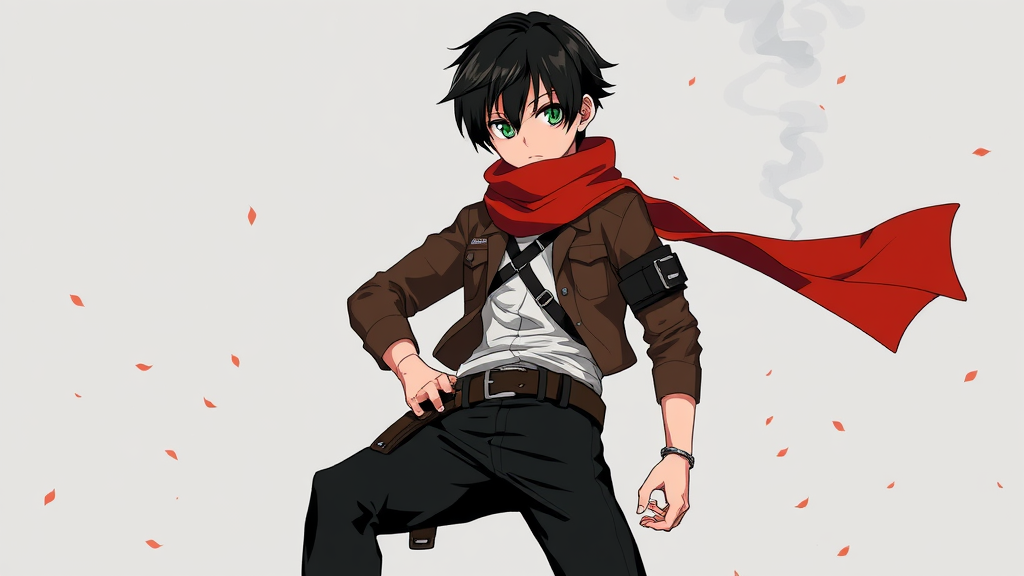 aot style, shingeki no kyojin, mikasa ackerman, 1girl, arm strap, bangs, black hair, black pants, athletic build, cowboy shot, floating embers, neutral grey backdrop, hair strands between eyes, harness detailing, long sleeves, direct gaze, fitted pants, iconic red scarf, layered shirt, cropped haircut, smoke wisping in the air, solitary figure, thigh strap, classic brown jacket, crisp white shirt, survey corps emblem, dynamic pose, stylized 3d, vibrant cartoon style, anime essence, sketch-like outlines, subtle skin texture, well-defined anatomy, teen character, striking green eyes, medium build, youthful and strong.