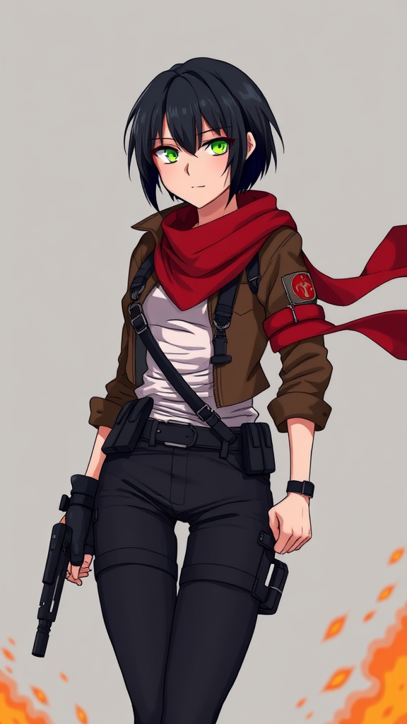 aot style, shingeki no kyojin, mikasa ackerman, 1girl, arm strap, bangs, black hair, dark pants, strong build, cowboy shot, glowing embers, muted grey background, hair falls between eyes, tactical harness, long sleeves, intense gaze, medium build, fitted pants, signature red scarf, white undershirt, cropped short hair, swirling smoke, solo focus, thigh strap, classic brown jacket, iconic survey corps insignia, high quality, dynamic 3d effect, vibrant cartoon essence, anime influence, subtle sketches, natural skin texture, detailed anatomy, youthful appearance, vivid green eyes, powerful presence.