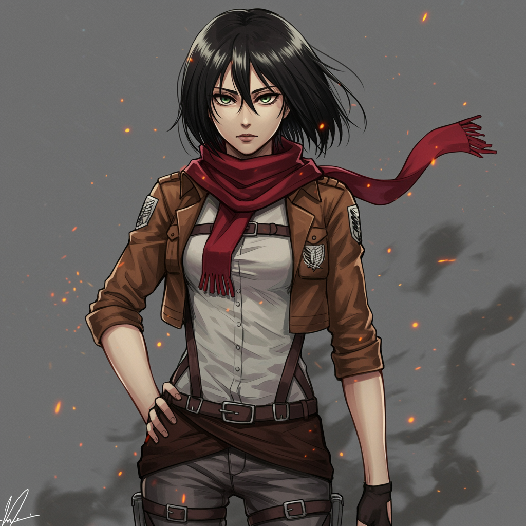aot style, shingeki no kyojin, mikasa ackerman-inspired character, female warrior, arm strap, bangs, dark hair, dark pants, medium build, dynamic pose, fiery embers floating, neutral grey background, hair framing face, tactical harness, long sleeves, engaging gaze toward viewer, red scarf wrapped around neck, fitted shirt, cropped hair, rising smoke, standing solo, utility thigh strap, worn leather jacket, crisp white shirt, member of elite corps, high-detail, 3d aesthetic, animation style, detailed sketches, balanced proportions, mature, intense green eyes, natural complexion.