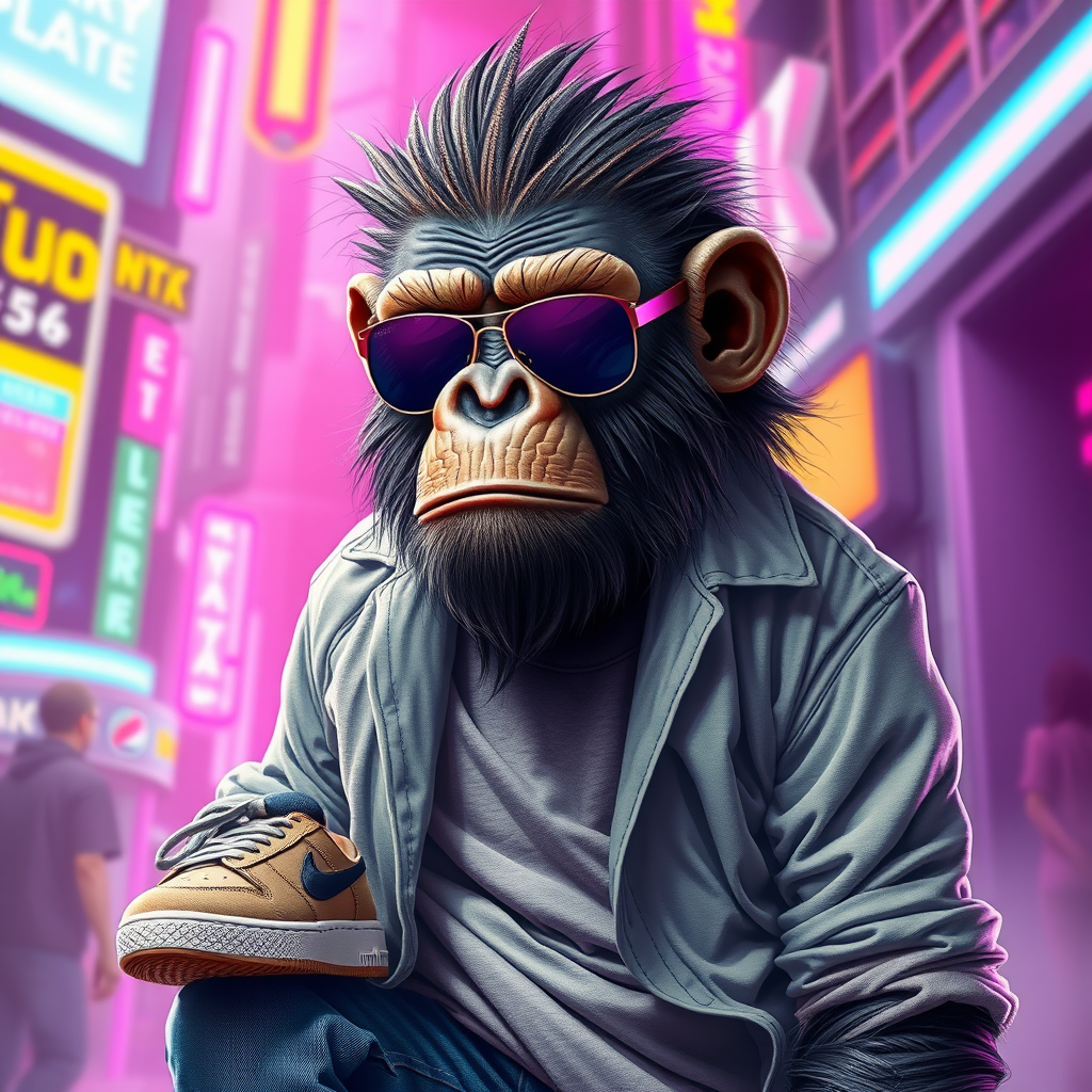 Ape monarch exuding casual style, donned in trendy sneakers and sleek sunglasses, paired with stylish jeans; set against a vibrant, futuristic cyberpunk backdrop. Full figure portrait reflecting masterpiece artistry, showcasing photorealistic detail and impeccable quality with a touch of creative flair.