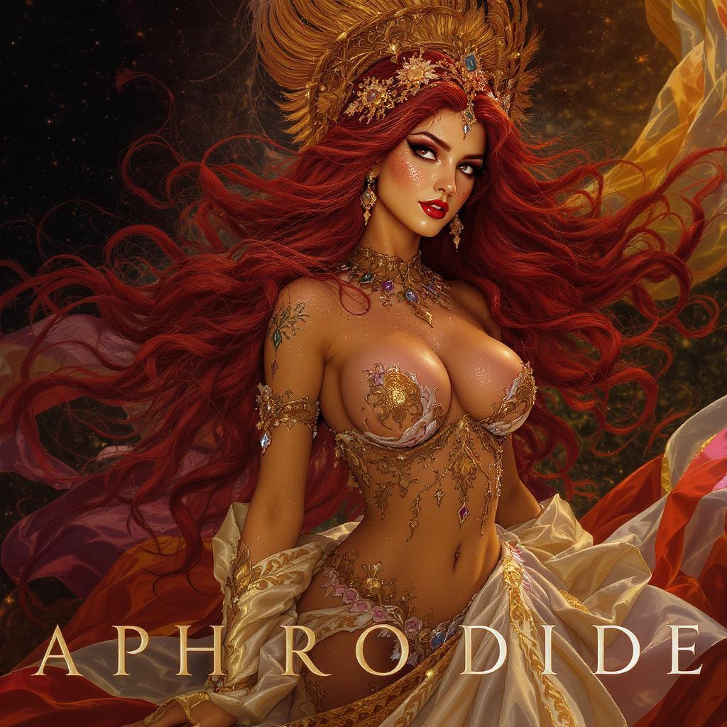 Aphrodite, mythology-inspired, adorned in an elaborate gown with intricate embroidery, a sheen of perspiration glistening on her upper body, hyper-detailed with vivid colors, surrounded by volumetric and cinematic lighting creating an epic atmosphere, crafted with extremely high detail in mind, post-processed to enhance every element, striking red hair cascading in very long, wavy tresses, complexion dotted with delicate freckles, styled for eye-catching wallpaper with a touch of film grain, embodying a 3D presence in a redshift style, featuring an opulent, exaggerated L-cup figure, visually interpreted in an illustration painting format, evocative of Alberto Seveso’s artistic essence for cover art creations.