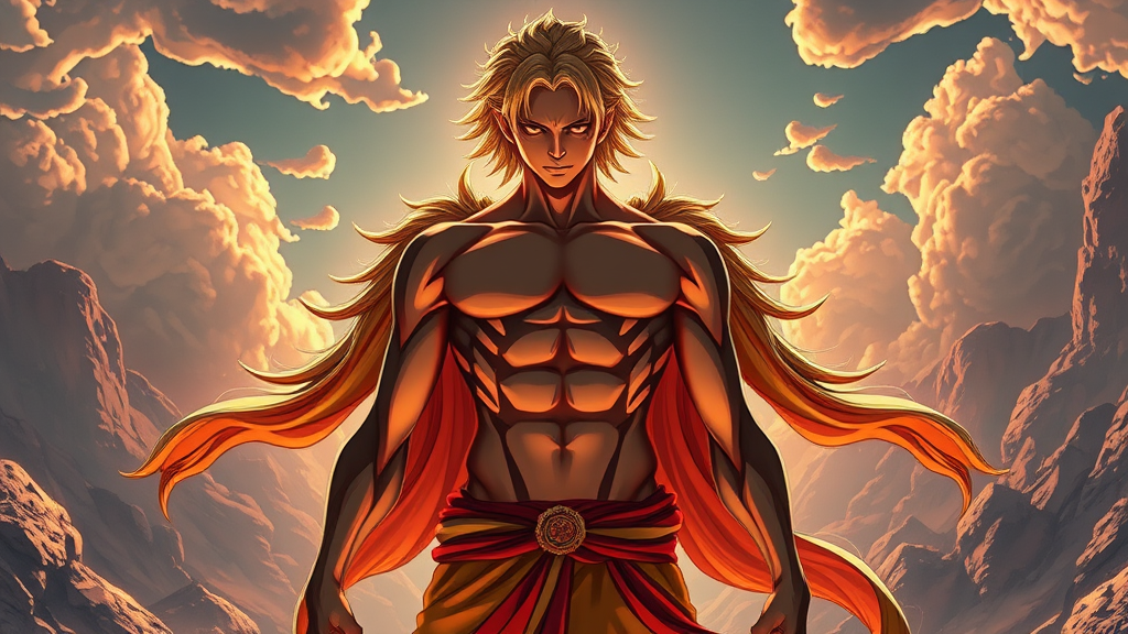 Apollo-inspired character from Greek mythology, reimagined as a One Piece character with a symmetrically balanced physique, captured in full body with intricate detailing and cinematic lighting. The high-contrast scene is set against a stunningly beautiful background. The artwork reflects character concept art style typically found on ArtStation, rendered in 8K clarity. Subtle creative elements are woven in to enhance the visual allure while staying true to the core concept, showcasing a dynamic and powerful presence.