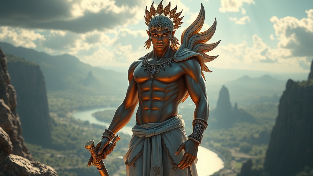 Apollo-inspired character, Greek mythology, One Piece influence, symmetrical physique, full body, intricate detail, cinematic lighting, high contrast, ArtStation-worthy, character concept art, 8K resolution, set against a stunning backdrop, beautiful scenery, dynamic composition, modern artistic twist, imaginative elements.