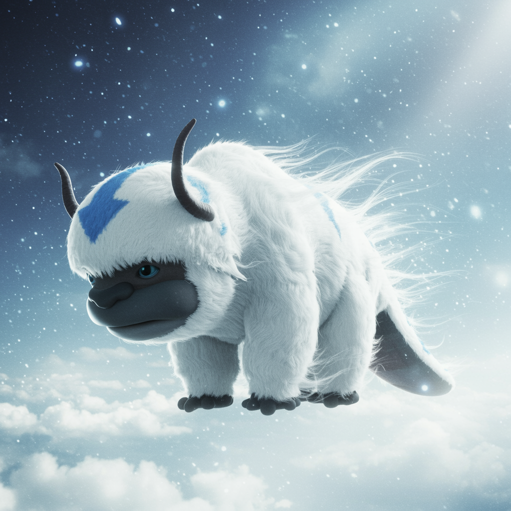 Appa, the majestic sky bison of Avatar Aang, is depicted with his iconic white and azure fur, exuding an ethereal presence. The long, flowing fur captures the wind as it moves, set against a luminous, enchanting background. The scene embodies a breathtaking, hyper-realistic, and highly detailed portrayal, with an evocative composition that tugs at the heartstrings. The lighting is epic and cinematic, enhancing every feature in stunning 32k UHD resolution. Influenced by Daz3D and DamShelma's artistic styles, the scene is imbued with subtle surrealism, maintaining a sense of awe. The atmosphere is enhanced with touches of anime aesthetics and inspired by the visual depth in Niji's work, with a smooth, dynamic sense of movement that's both powerful and serene.