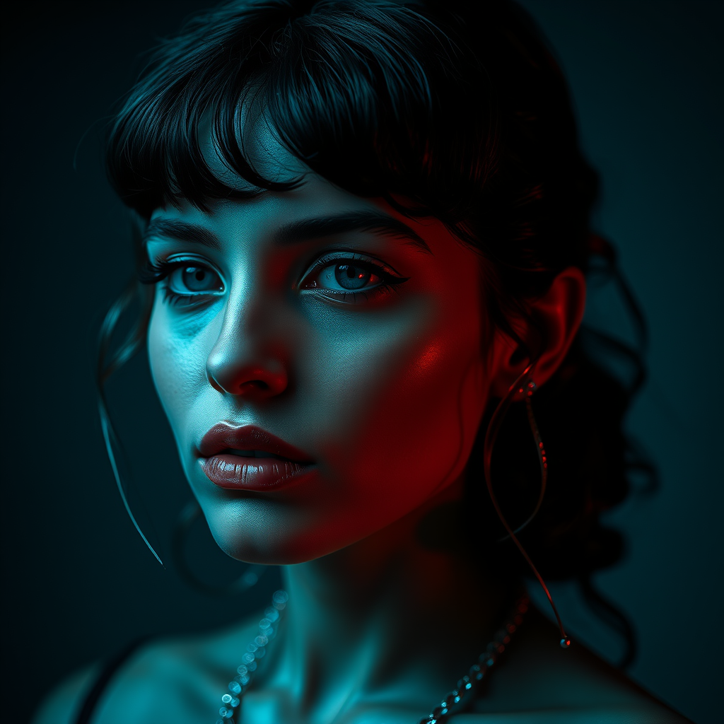 Aquamarine twilight on skin, amber flecks in hair, fusion of classic glamour and contemporary edge in a dark palette, inspired by Daisy Buchanan, scenes from "The Great Gatsby" and styles of Andy Warhol, overall aesthetic of a 1920s flapper with the mystique of a 1950s Hollywood star, intricately detailed and hyper-realistic in a high resolution image of 8K resolution, cinematic lighting with an overhead spotlight effect, captured in a 2:3 aspect ratio, 750 x 562 pixels in size, of the highest image quality with a medium to highly detailed presentation, Smart Sharpen and Unsharp mask applied, slight vignette and slight burn applied to emphasis the model's face, a delicate balance of warm and cool tones to create a harmonious and appealing image.
