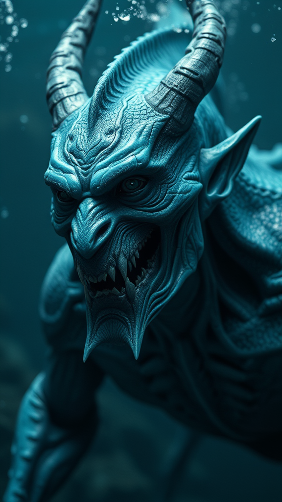 Aquatic demon with a humanoid figure, angular features, and a deep azure skin tone, sporting a furrowed brow and menacing, sharp teeth. The mouth is slightly agape, revealing an eerie, otherworldly presence in its expression. Set against a mystic underwater background, the scene is captured in stunning 3D with Unreal Engine 4, utilizing cinematic lighting to enhance the creature's ominous aura and the ethereal beauty of its submerged world.