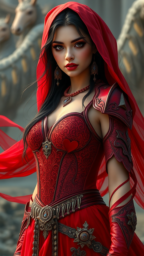 Arabian-inspired woman adorned in a crimson corset and flowing scarlet gown, evoking the style of Karol Bak, Alena Aenami, and Artgerm. She embodies the essence of fantasy with her intricate, hyperrealistic details in stunning 4k and 8k quality. This mesmerizing figure is a blend of elegance and strength, featuring elements of exquisite red armor. Her alluring gaze and striking presence are reminiscent of the detailed works of Julie Bell and Beeple, presenting a breathtaking fusion of realistic fantasy art and high-definition storytelling.
