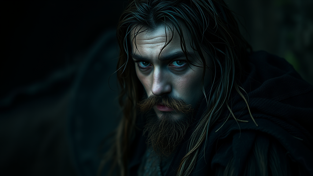 Aragorn in a glamour shot, hauntingly dark, intricately detailed, rendered in octane, with a wet and dense atmosphere, epic and dramatic, eerily empty yet captivating, reminiscent of trail cam footage, photorealistic with hyperornate details, inspired by the world of Lord of the Rings and John Tolkien, captured in the style of photographers Irakli Nadar and Reylia Slaby, invoking a sense of mystery and intrigue.