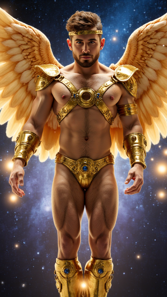 ARCHANGEL, celestial, galaxy protector, universal warrior Angel. Hypermasculine Caucasian male. Tall, muscular, sinewy, broad shoulders, broad chest, wide back, narrow waist, strong muscular legs, thick hairy forearms. Bodybuilder physique. Extremely hirsute hairy chest, abs, arms, thighs, legs {{{hirsute hairy chest and abs}}}. Dark brown hair, short length wavy fade style, cut close on sides with tousled curls on top {{{short hair}}}. Metallic golden circlet headband around head/brow. Strong brow, squared jaw, thick brows, handsome, masculine, rugged good looks. Clean shaven, beardless face. {{Electric blue eyes}} glowing and bright. Metallic gold pauldrons with sapphire gems on both shoulders, metallic gold bracers with sapphire accents on his hairy arms. Metallic gold harness across his hirsute hairy chest; gold ring in the middle, metallic straps on both sides of shoulders, the other two under each Pectoral. An ornate gold belt with sapphire gems around his waist. Metallic gold jockstrap, full and girthy. Metallic gold boots, up to mid calf. Enormous gold Angel wings, spread open and flying. He shines with a golden aura of light, bright as the sun. Full body pose, flying through space towards Heaven.