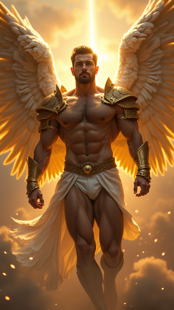ARCHANGEL, celestial, galaxy protector, universal warrior Angel. Hypermasculine Caucasian male. Tall, muscular, sinewy, broad shoulders, broad chest, wide back, narrow waist, strong muscular legs, thick hairy forearms. Bodybuilder physique. Extremely hirsute hairy chest, abs, arms, thighs, legs {{{hirsute hairy chest and abs}}}. Dark brown hair, short length wavy fade style, cut close on sides with tousled curls on top {{{short hair}}}. Metallic golden circlet headband around head/brow. Strong brow, squared jaw, thick brows, handsome, masculine, rugged good looks. Clean shaven, beardless face. {{Electric blue eyes}} glowing and bright. Metallic gold pauldrons with sapphire gems on both shoulders, metallic gold bracers with sapphire accents on his hairy arms. Metallic gold harness across his hirsute hairy chest; gold ring in the middle, metallic straps on both sides of shoulders, the other two under each Pectoral. An ornate gold belt with sapphire gems around his waist. Metallic gold jockstrap, full and girthy. Metallic gold boots, up to mid calf. Enormous gold Angel wings, spread open and flying. He shines with a golden aura of light, bright as the sun. Full body pose, flying through space towards Heaven.