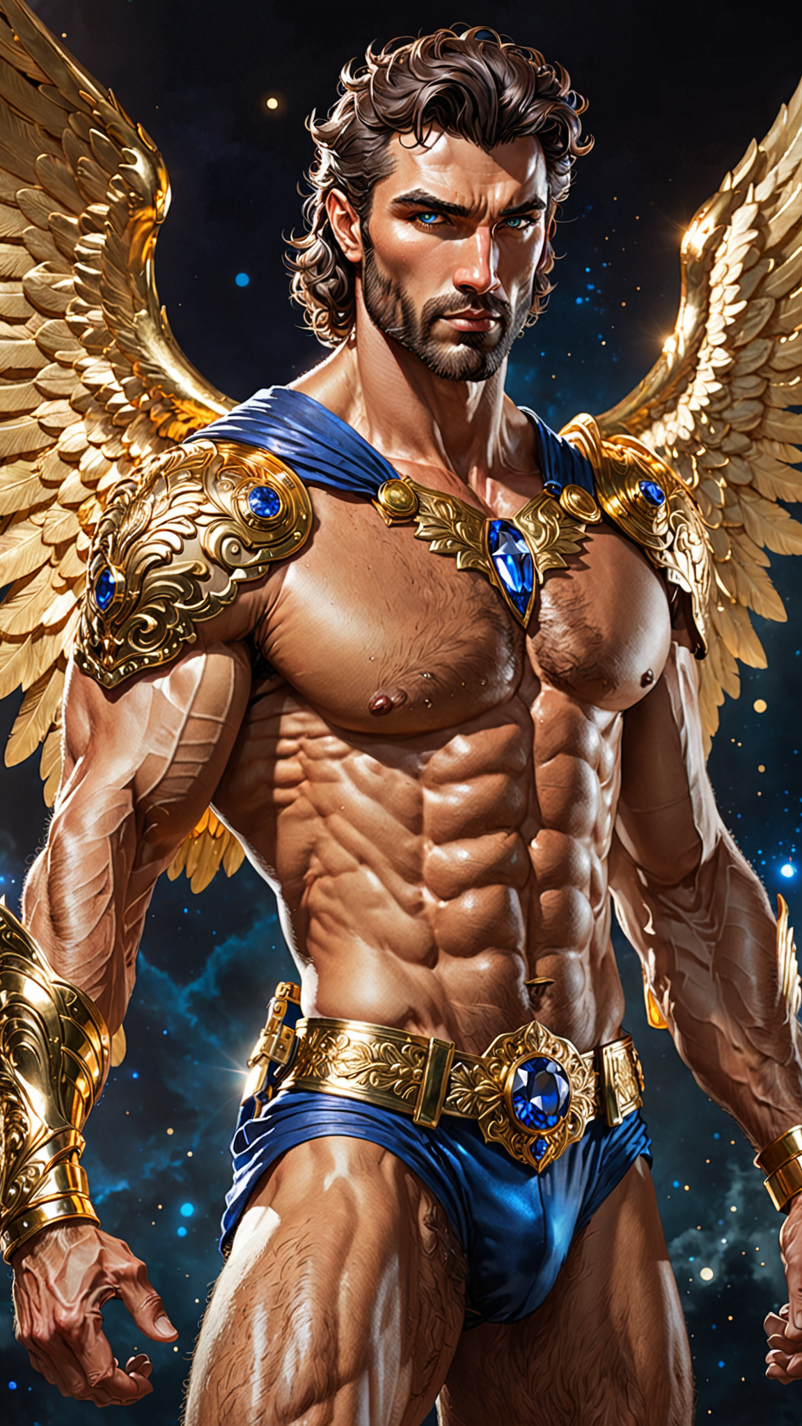 Archangel, celestial, galaxy protector, warrior Angel, hirsute. Caucasian male, hypermasculine. Tall. muscular, sinewy, broad shoulders, broad chest, wide back, narrow waist, strong muscular legs, thick hairy forearms. Bodybuilder physique. Extremely hairy chest, abs, arms, thighs, legs. Dark brown hair, short length wavy fade style, cut close on sides with tousled curls on top. {{{SHORT HAIR}}} Golden headband tied around head/brow. Strong brow, squared jaw, thick brows, handsome, rugged good looks. Clean shaven, beardless. {{Electric blue eyes}} glowing and bright. Metallic gold pauldrons with sapphire gems on both shoulders, metallic gold bracers with sapphire accents on his hairy arms. Metallic gold harness across his hirsute hairy chest; gold ring in the middle, metallic straps on both sides of shoulders, the other two under each Pectoral. An ornate gold belt with sapphire gems around his waist. Metallic gold loincloth. Metallic gold boots, up to mid calf. Enormous gold Angel wings, spread open and flying. He shines with a golden aura of light, bright as the sun. Full body pose, flying through space.