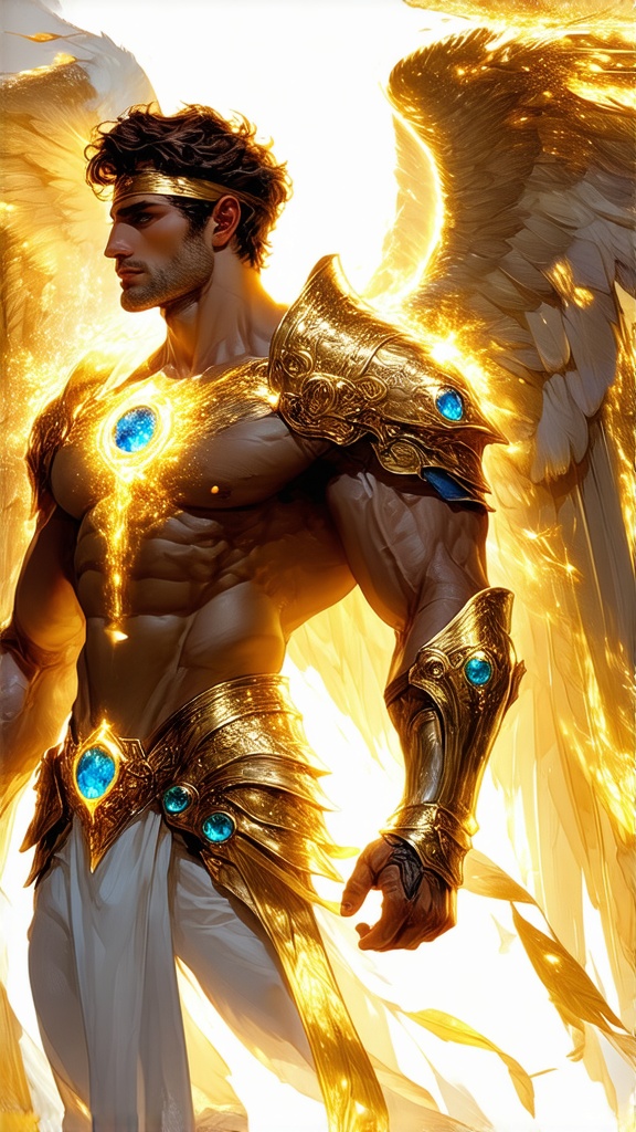 Archangel, celestial, galaxy protector, warrior Angel. Caucasian male, hypermasculine. Tall. muscular, sinewy, broad shoulders, broad chest, wide back, narrow waist, strong muscular legs, thick hairy forearms. Bodybuilder physique, big muscles. Extremely hairy chest, abs, arms, thighs, legs. {{{HAIRY BODY, hirsute}}} Dark brown hair, short length wavy fade style, cut close on sides with tousled curls on top. {{{SHORT HAIR}}} Golden headband tied around forehead/brow. Strong brow, squared jaw, thick brows, handsome, rugged good looks. Clean shaven, beardless, hairless face. {{Electric blue eyes}} glowing and bright. Metallic gold pauldrons with sapphire gems on both shoulders, metallic gold bracers with sapphire accents on his hairy arms. Metallic gold harness across his hirsute hairy chest; gold ring in the middle, metallic straps on both sides of shoulders, the other two under each pectoral. An ornate gold belt with sapphire gems around his waist. Metallic gold briefs, covering his girthy loins. Metallic gold thigh guards. Metallic gold boots, up to mid calf. Enormous gold Angel wings, spread open and flying. He shines with a golden aura of light, bright as the sun. Full body pose, flying through space, a shining galaxy swirls in the background
