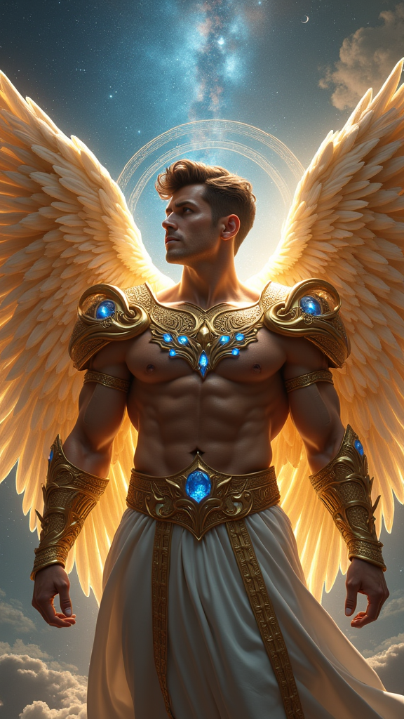 ARCHANGEL, divine celestial guardian of galaxies, ethereal universal warrior. Hypermasculine Caucasian male, heroic proportions, 8 heads tall. Greek god physique: sharply defined musculature, broad trapezius muscles, expansive chest, dramatic V-taper to narrow waist, powerful quadriceps. Classical bodybuilder aesthetic with prominent muscle striations. Dense, masculine body hair pattern across chest, abs, arms, and legs, creating organic textural contrast {{{pronounced hirsute definition}}}. Rich dark brown hair styled in modern wavy fade, precision-cut sides transitioning to volumized curls atop {{{textured short hair}}}. Ornate aureate circlet with celestial engravings adorning noble brow. Chiseled facial features: strong orbital ridge, defined cheekbones, square Germanic jaw, thick expressive brows. Clean-shaven visage radiating masculine beauty. {{Luminous electric blue eyes}} emanating divine light, crystalline intensity. Baroque golden pauldrons inlaid with lustrous deep blue sapphires, matching ornamental bracers with azure gemwork adorning muscular forearms. Intricate golden harness crossing hirsute torso, centered medallion, geometric strap work framing musculature. Ceremonial golden belt with sapphire cabochons. Metallic gold athletic supporter accentuating godly form. Mid-calf golden greaves with detailed filigree. Massive auric wings, 20-foot span, individual feathers catching starlight. Radiating golden aureole, corona-bright nimbus suffusing form. Dynamic ascending pose, soaring through star-studded cosmic void toward celestial realm. Dramatic rim lighting, chiaroscuro modeling, volumetric god rays. Cinematic wide-angle perspective, extreme low angle view. Photorealistic rendering, high detail, octane render, volumetric lighting, subsurface scattering, 8K resolution.