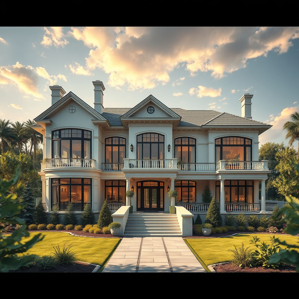 Architectural drawing of a dream home, photorealistic, cinematic composition, high detail with ultra-realistic textures, cinematic lighting creating depth and warmth, intricate depth of field highlighting key features, hyper-detailed design showcasing elegant architectural elements, beautifully color-coded with harmonious tones, rendered in 8k resolution, set on a sunny day with vivid skies, numerous details including expansive windows, lush greenery surrounding the site, and a sleek modern facade with tasteful accents.