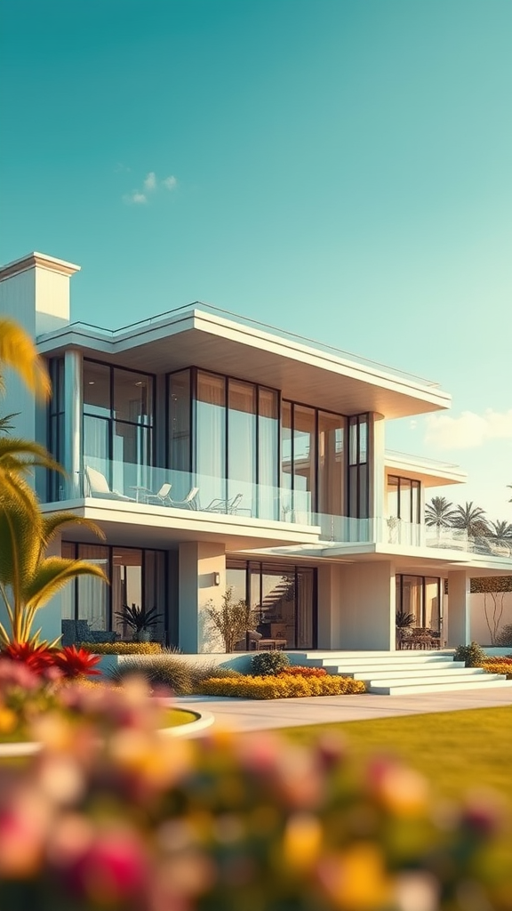 Architectural drawing of a dream home, photorealistic, cinematic composition, with ultra-realistic detail and cinematic lighting; features include hyper-detailed structure, beautifully color-coded elements, captured in stunning 8k resolution on a sunny day; includes depth of field that artfully blurs background, intricate textures and refined material finishes, expansive glass windows reflecting natural sunlight, modern landscaping with vibrant greenery, sleek and elegant lines, harmoniously balanced architectural elements, subtle artistic enhancements for a touch of whimsy and creativity, ensuring the core concept of a luxurious and captivating dwelling is maintained.