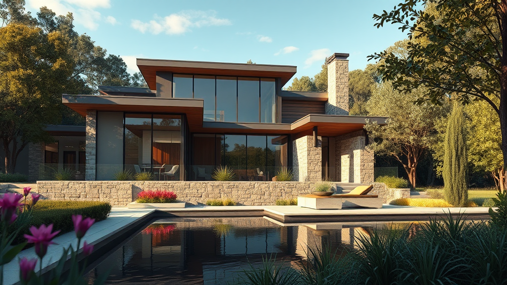 Architectural drawing of a dream home set in a serene landscape, showcasing a modern design with sleek lines and expansive glass windows; the composition is beautifully cinematic, capturing the essence of a sunny day with dramatic, hyper-detailed lighting that casts soft shadows across the façade, highlighting the intricate textures of the natural stone and wood accents; the scene is rendered in ultra-realistic 8k resolution, with a shallow depth of field that brings the foreground elements into sharp focus while gently blurring the lush garden surroundings; the color palette is tastefully balanced, emphasizing the earthy tones of the materials and the vibrant hues of the carefully curated garden, creating a harmonious blend between the architecture and nature, all enhanced by subtle creative touches such as a reflecting pool that mirrors the sky, and an outdoor seating area that invites relaxation.