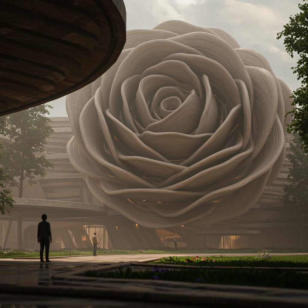 A photorealistic 3D architectural exterior rendering of a building inspired by the layered structure of a rose flower, in the style reminiscent of Zaha Hadid, using Unreal Engine with raytracing and enhanced by post-processing techniques. Sculpted details developed in ZBrush and textured with Substance Painter, capturing a design trending on ArtStation. The image features cinematic lighting and composition, adhering to the rule of thirds, with ultra-detailed textures set against a low-contrast, naturally lit environment. A realistic, light fog adds atmospheric depth, with volumetric lighting enhancing the hyperrealism. The scene is rendered in Unreal Engine 5 with a 35mm lens effect, combined with elements of matte painting and movie concept art to achieve an ultra-photorealistic and hyper-detailed finish. Rendered using advanced techniques like Corona, Octane, and Redshift for an 8k resolution output, maintaining the core concept while making subtle creative modifications.