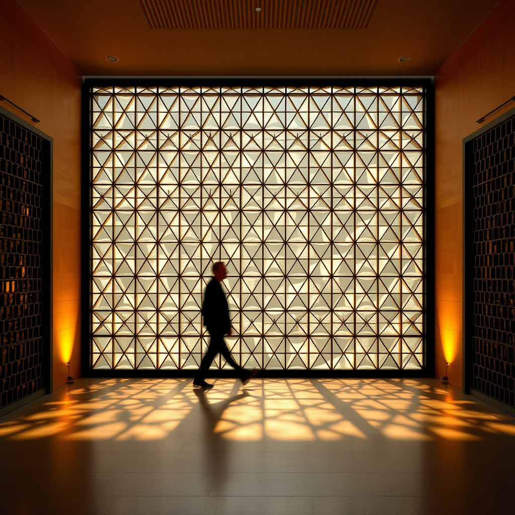 Architectural photography captured with a Sony a7R IV and 24-70mm f/2.8 GM lens, settings at f/5.6, 1/125s, ISO 400. The scene features a triangular-patterned translucent glass wall installation framed by a black metal grid, illuminated with warm golden backlight casting intricate honeycomb shadows. A silhouette of a person walking adds dynamic interest against the backdrop of a zen-style interior design. The ambiance is enhanced by an amber glow and professional studio setup using two continuous LED panels at 2800K, emphasizing geometric repetitive patterns. The photograph showcases high contrast, ultra-sharp details, and photorealistic quality with rich detail in 48K resolution, maintaining the essence of the original concept with subtle creative refinements.