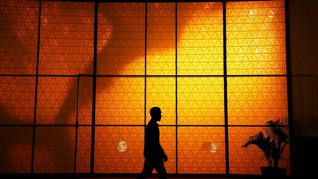 Architectural photography captured with a Sony a7R IV and 24-70mm f/2.8 GM lens, settings at f/5.6, 1/125s, ISO 400. The scene features a triangular pattern translucent glass wall with a black metal grid frame, infused with a warm golden backlight that casts intricate honeycomb shadows. In the foreground, a silhouette of a person walks through a zen-inspired interior, enriched with an amber glow creating an atmospheric ambiance. The shot utilizes a professional studio setup with dual continuous LED panels set to 2800K for backlighting. The composition emphasizes geometric repetitive patterns with high contrast and ultra-sharp details, achieving photorealistic quality in 48K resolution, showcasing rich detailing and a touch of creative innovation.