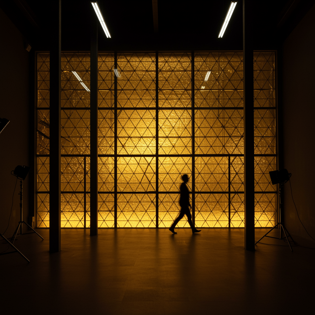 Architectural photography captured with a Sony A7R IV, utilizing a 24-70mm f/2.8 GM lens at f/5.6, 1/125s, ISO 400, featuring a triangular pattern translucent glass wall installation framed by a black metal grid. The scene is bathed in a warm golden backlight, casting intricate honeycomb shadows. A silhouette of a person walks through this zen interior setting, enhanced by an amber glow and atmospheric lighting. The setup includes professional studio lighting with two continuous LED panels set to 2800K for backlighting, creating geometric repetitive patterns. The image boasts high contrast, ultra-sharp details, and photorealistic quality at 48K resolution with rich detailing. The overall feel is modern and minimalistic, maintaining the essence of sophisticated architectural design.