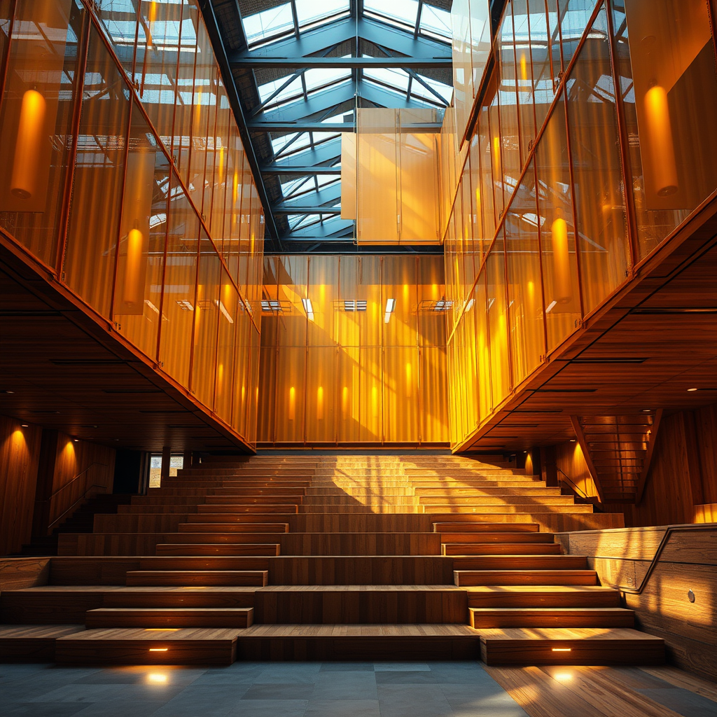 Architectural photography captures a mesmerizing space where geometry and light dance harmoniously, creating a visual symphony. Warm-toned translucent panels cascade gracefully, intersecting with robust wooden steps that function as both pathway and seating, imparting a sense of contemporary warmth. The environment feels spacious yet intimate, with an industrial flair evident in the exposed ceilings and a blend of raw and polished surfaces engaging in a harmonious dialogue. The photography setup employs a Sony α7R IV camera, paired with a Sony FE 24-70mm f/2.8 GM lens, calibrated to an aperture of f/8 for ideal depth of field and sharpness, and a shutter speed of 1/125 to capture the ambient interplay of light, maintaining ISO at 100 for superior image quality. Utilizing RTX 4090 shader and Unreal Engine 5, the scene is illuminated with realistic lights, showcasing hyper detail, high contrast, and highlight effects, all in ultra-realistic 16K UHD --ar 9:16 --style raw --stylize 750.