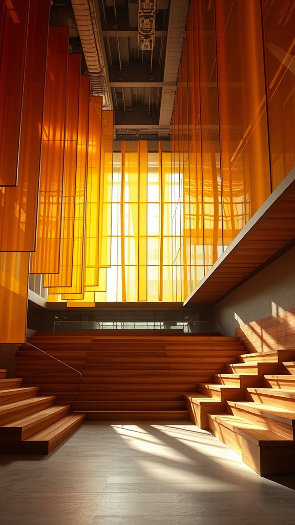 Architectural photography captures a striking interplay of geometry and light, creating a visual symphony. Warm-toned transparent panels cascade and intersect with robust wooden steps that double as seating, infusing the space with modernity and warmth. The area feels open yet intimate, with an industrial aesthetic featuring exposed ceilings and a blend of raw and polished surfaces in harmonious conversation. The photograph is taken with a Sony α7R IV camera, paired with a Sony FE 24-70mm f/2.8 GM lens set to an aperture of f/8 for optimal depth of field and sharpness. A shutter speed of 1/125 freezes the ambient light play, while an ISO of 100 ensures the finest image quality. Utilizing RTX 4090 shader and Unreal Engine 5, the image features realistic lighting, hyper detail, high contrast, and highlights, presenting an ultra-realistic scene in 16K UHD, framed in a 9:16 aspect ratio, with a raw style and a stylize value of 750.
