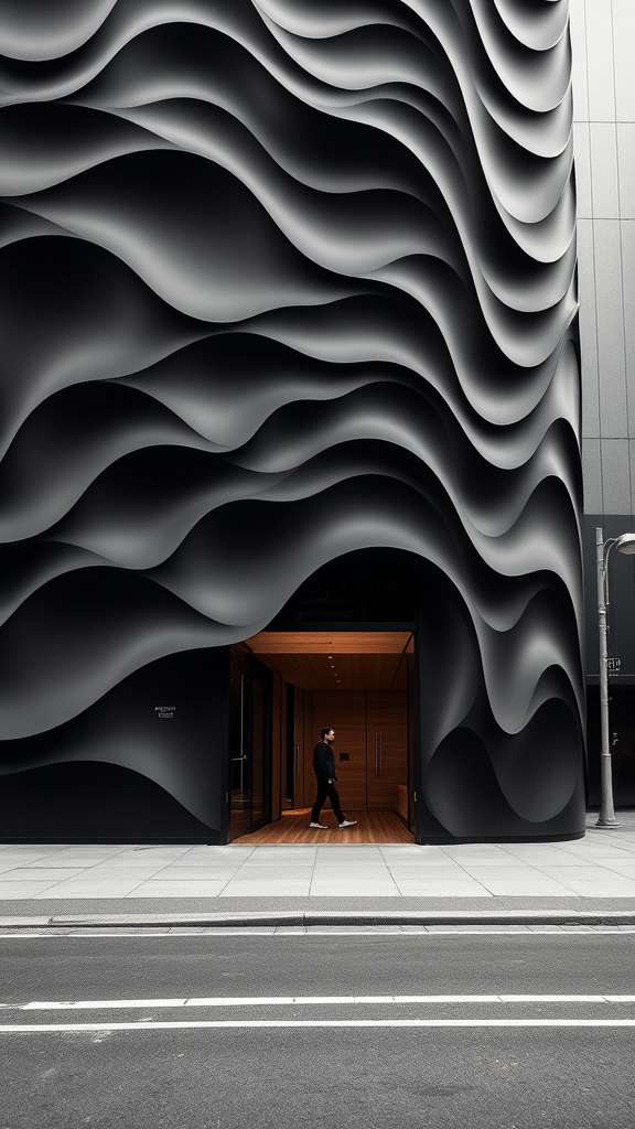 Architectural photography capturing a commercial building with a flowing black facade, photographed with a Canon EOS R5 and RF 16-35mm f/2.8L USM lens. Settings: f/8.0, 1/250s, ISO 100, at a focal length of 24mm. The composition is centered with a lone silhouette of a person for scale, highlighting the dramatic wave-patterned exterior in nuanced monochromatic tones. Features include a distinct wooden entrance and soft, natural lighting that accentuates gradient transitions. Set in an urban street environment with an immaculate sidewalk in the foreground, the photograph embodies a professional architectural style. Details are sharply defined, with geometric curves in focus, showcasing a rich monochromatic range and hyperrealistic architectural features, all wrapped in a cinematic and contemporary urban atmosphere.