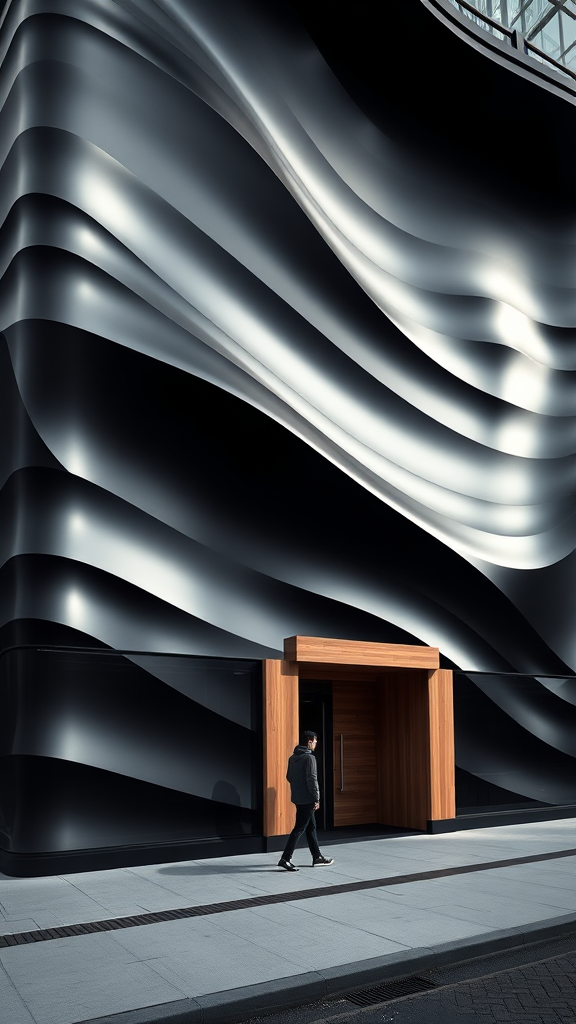 Architectural photography capturing a commercial building with a dynamic, undulating black facade. Photographed using a Canon EOS R5 with an RF 16-35mm f/2.8L USM lens, settings at f/8.0, 1/250s, ISO 100, and a 24mm focal length. The composition is centered, featuring a lone figure silhouetted for scale. The building's dramatic wave-pattern exterior is highlighted in shades of monochrome, complemented by a distinctive wooden entrance. The scene is lit softly by natural light that accentuates the facade's gradients. Set in an urban environment with a pristine sidewalk in the foreground, the style reflects professional architectural photography, capturing the sharp details and geometric curves of the structure. The image showcases rich monochromatic gradations with hyperrealistic architectural features, creating a cinematic urban contemporary ambiance.