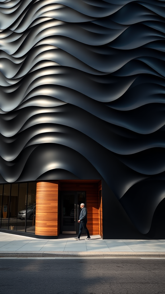 Architectural photography capturing a modern commercial building with a striking, undulating black facade. Taken with a Canon EOS R5 and RF 16-35mm f/2.8L USM lens, settings f/8.0, 1/250s, ISO 100, at a 24mm focal length. The composition is centered, featuring a single person silhouette to provide scale. The exterior showcases dramatic wave patterns in a rich monochromatic palette, complemented by a distinctive wooden entrance. Soft natural lighting highlights the gradient nuances of the facade. Set in an urban street environment, the foreground displays a pristine sidewalk, embodying a professional architectural photography style. Details are sharp, with an emphasis on geometric curves and hyperrealistic architectural elements. The overall mood is cinematic, reflecting an urban contemporary aesthetic.