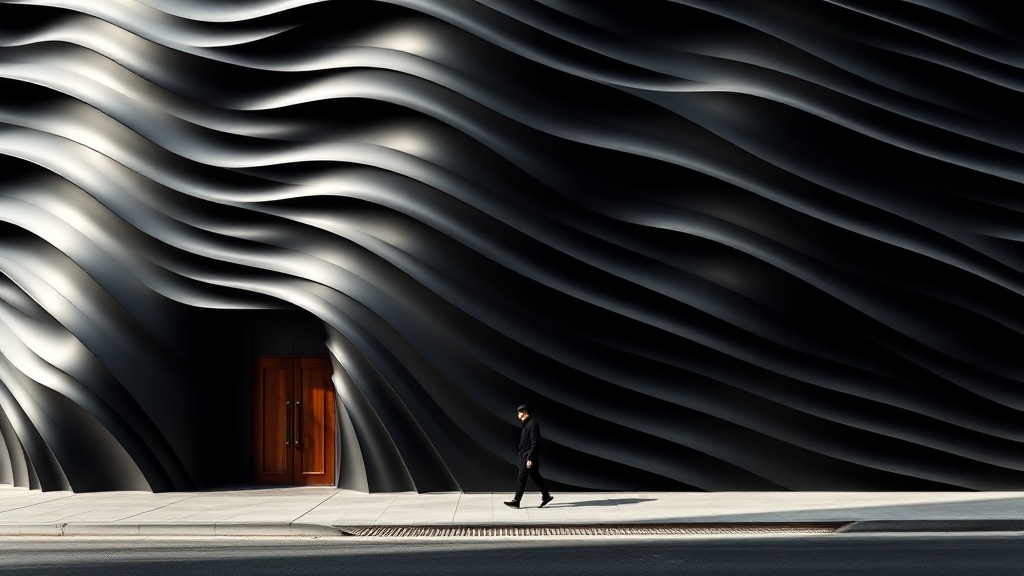 Architectural photography of a commercial building featuring an undulating black facade, captured with a Canon EOS R5 and RF 16-35mm f/2.8L USM lens at f/8.0, 1/250s, ISO 100, and 24mm focal length. The composition is centered, showcasing a single person silhouette for scale against a dynamic wave-pattern exterior in monochromatic tones. The scene includes a wooden entrance detail and is bathed in soft natural lighting that emphasizes the gradient effect of the facade. Set in an urban street environment, the image presents a clean sidewalk in the foreground and embodies a professional architectural photography style. Sharp details are highlighted, with geometric curves accentuated to create a rich monochromatic gradation. The hyperrealistic architectural details convey a cinematic mood, reflective of an urban contemporary style.