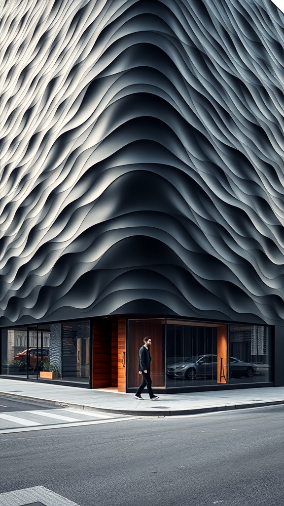 Architectural photography focusing on a commercial building featuring an undulating black facade, captured using a Canon EOS R5 with an RF 16-35mm f/2.8L USM lens. Settings: f/8.0, 1/250s, ISO 100, at a 24mm focal length. The composition is centered with a silhouette of a person for scale. The building showcases a dramatic wave-patterned exterior in monochrome tones, complemented by a wooden entrance detail. Soft natural lighting enhances the gradients, set in an urban street scene with a clean sidewalk in the foreground. The image demonstrates a professional architectural photography style with sharp details, emphasizing geometric curves, rich monochromatic gradation, and hyperrealistic architectural elements. The overall atmosphere is cinematic, reflecting an urban contemporary style. Creative modifications include subtle integration of metallic accents within the facade, introducing a dynamic play of light reflections.